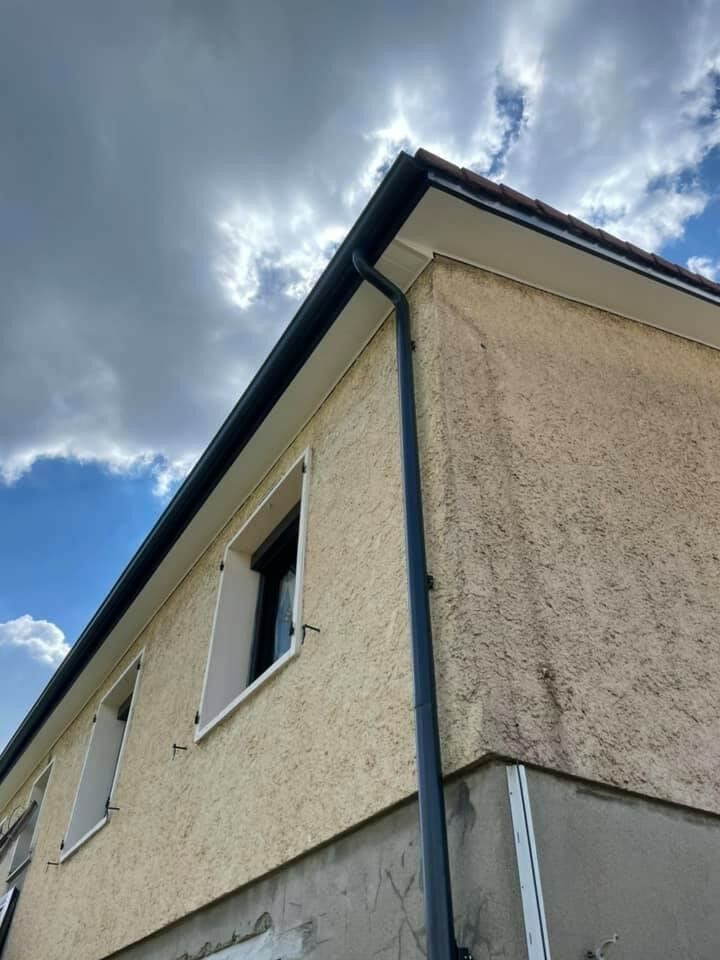 Frisettes pvc blanches , habillages bandeaux aluminium ral 7016 , gouttières aluminium demie rondes ral 7016 , descentes aluminium diamètre 80 ral 7016