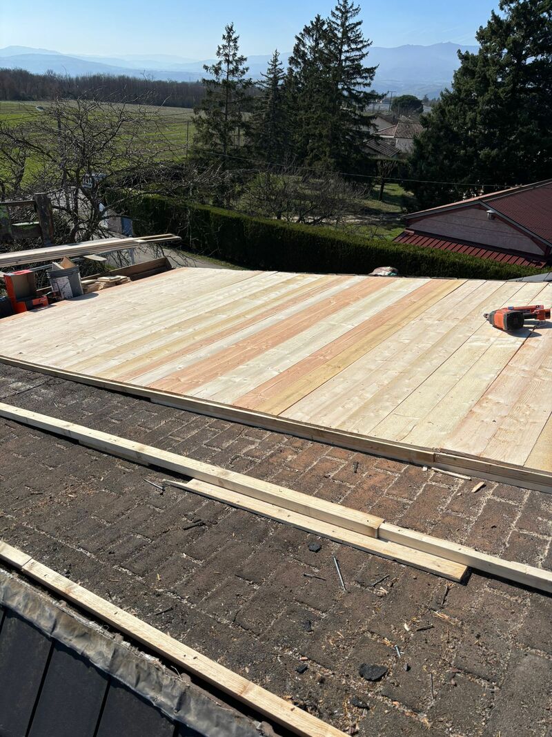 📌 Étanchéité et protection structurelle Après la pose du voligeage en bois, une natte structurée a été installée sur l'ensemble de la surface. Ce composant technique joue un rôle double : il assure une couche d'étanchéité supplémentaire tout en permettant une micro-ventilation sous les éléments métalliques. Cette protection est essentielle pour préserver la longévité des supports en bois contre l'humidité résiduelle.