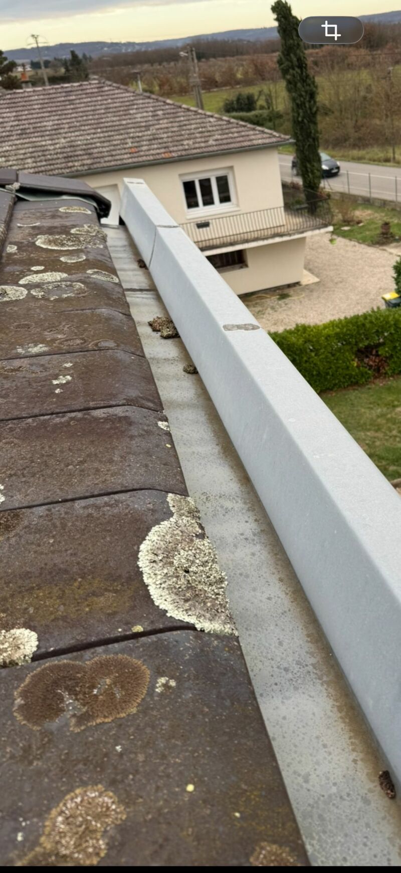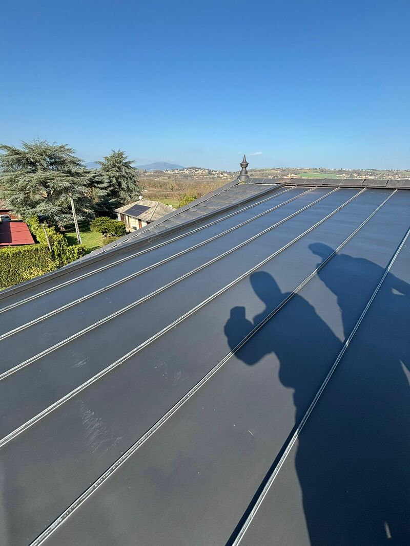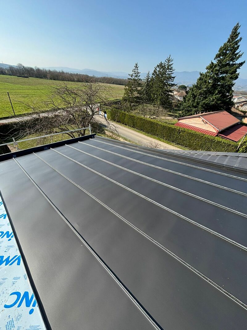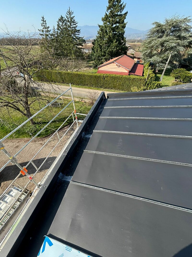 📌 Habillage des rives et sécurisation Le chantier s'est achevé par les finitions périphériques avec la pose de rives en zinc anthracite, protégeant les bords de la toiture contre les intempéries et le vent. Enfin, l'installation d'une main courante en zinc anthracite vient couronner l'ouvrage, offrant une finition soignée et robuste qui souligne les lignes de la toiture tout en protégeant les acrotères ou les rebords de murs.