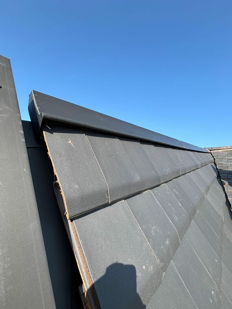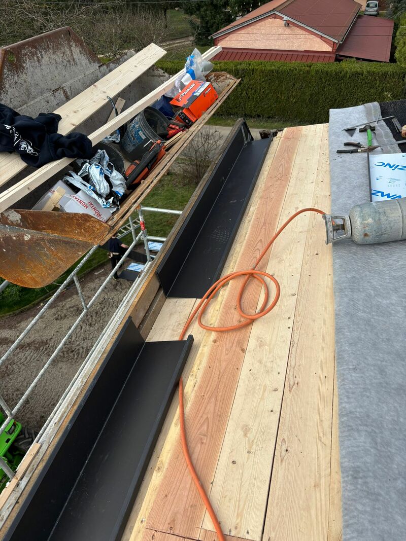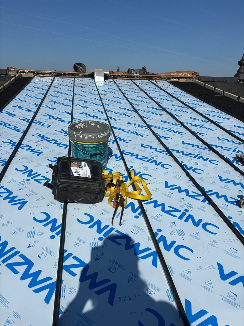 📌 Évacuation et finitions d'étanchéité en zinc Le cœur du travail de zinguerie a débuté par la mise en place d'un couloir en zinc anthracite, conçu pour assurer une évacuation fluide des eaux de pluie. Pour garantir une étanchéité parfaite entre les différentes sections, un joint de bout également en zinc anthracite a été posé. Le choix de ce matériau coloré permet d'allier performance technique et esthétique contemporaine.