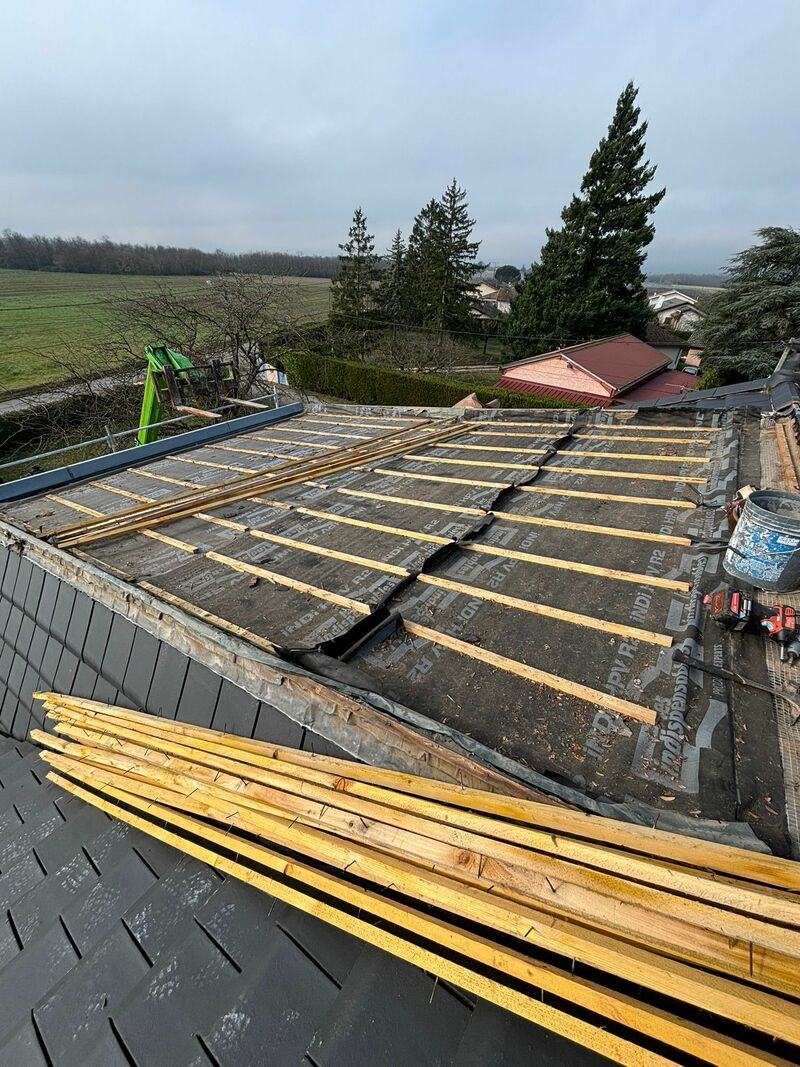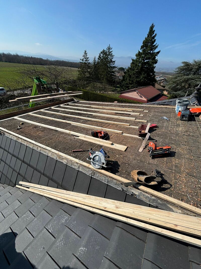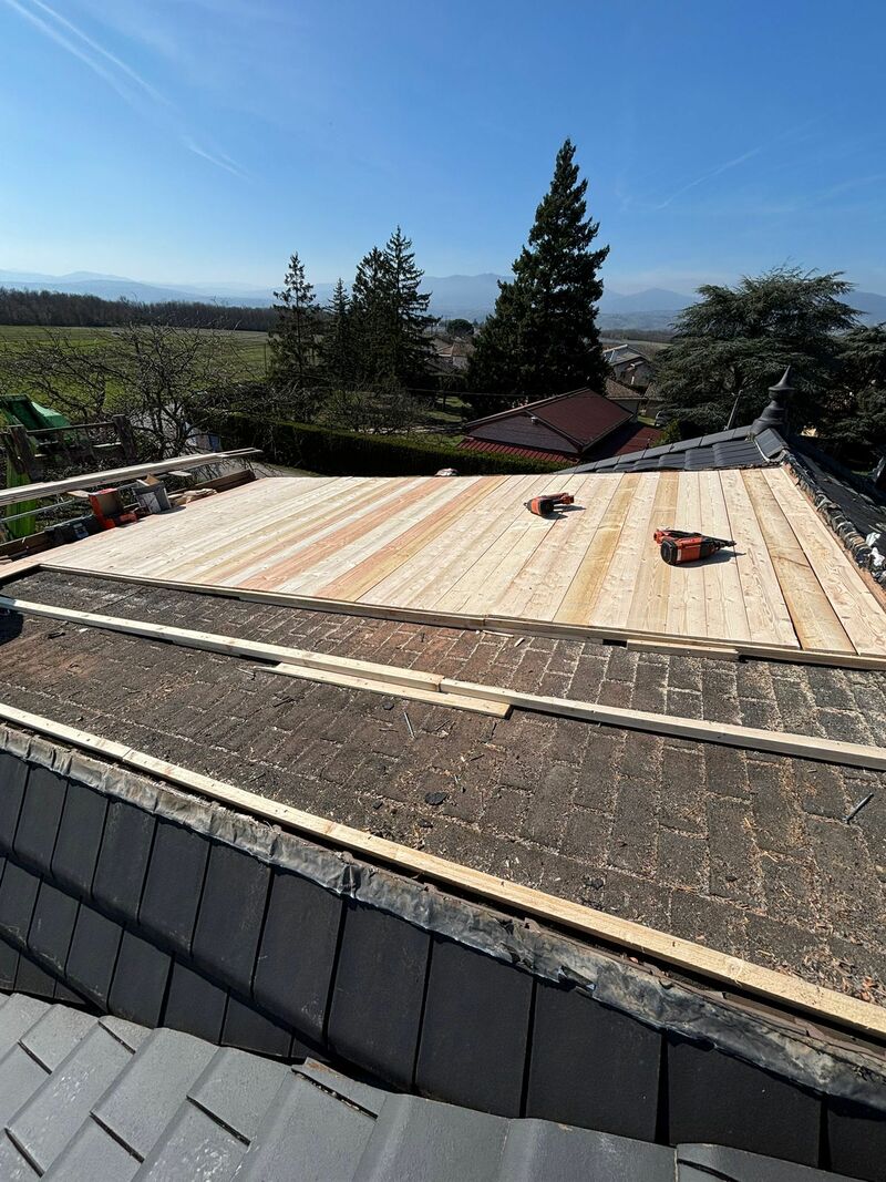 📌 Préparation et mise à nu de la structure La première phase a consisté au démontage complet de l'ancienne couverture en tuiles. Une fois la charpente dégagée, un travail de précision a été effectué avec le calage de la toiture. Cette étape est cruciale pour rattraper les éventuels faux-niveaux de la charpente existante, garantissant ainsi une surface parfaitement plane pour recevoir la nouvelle volige.