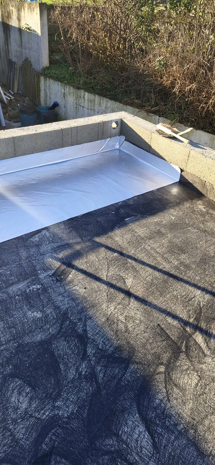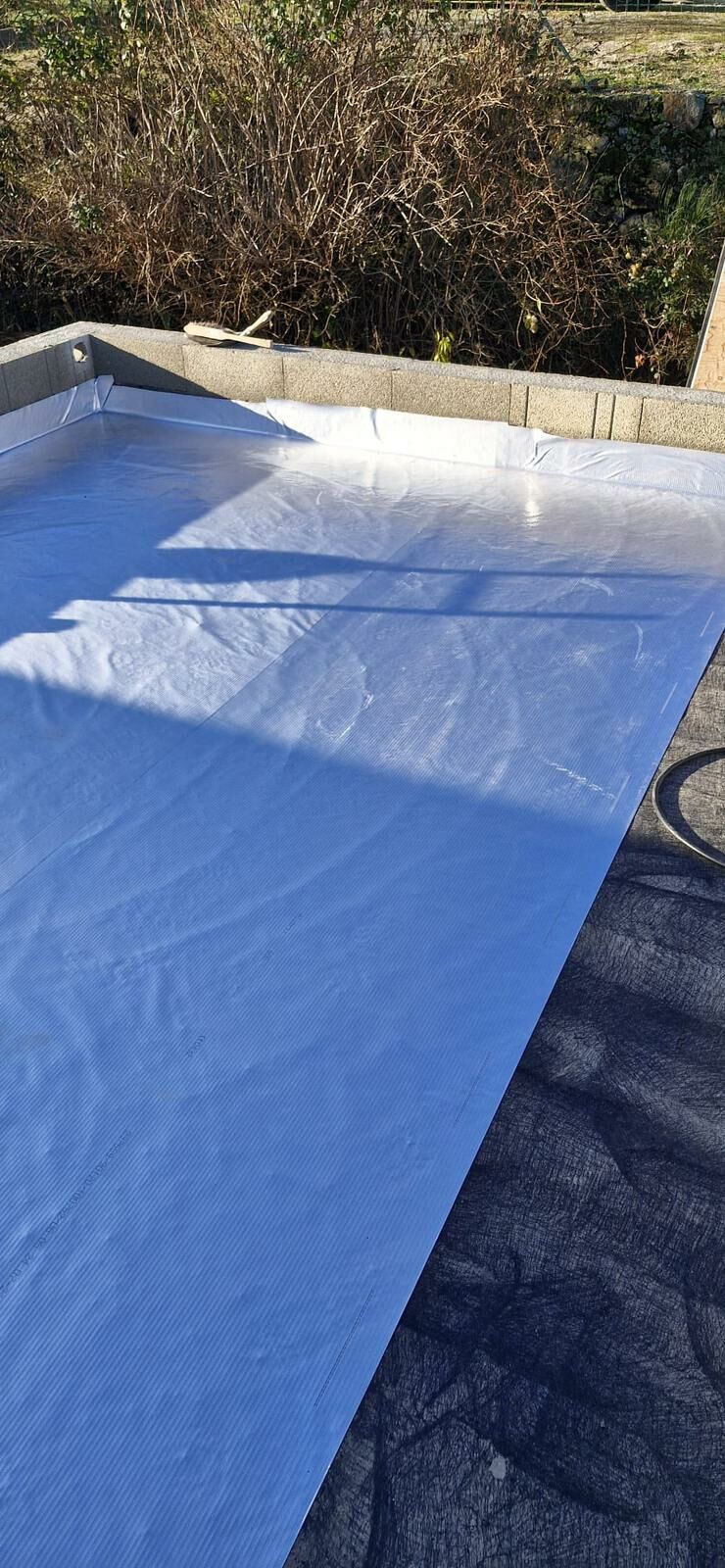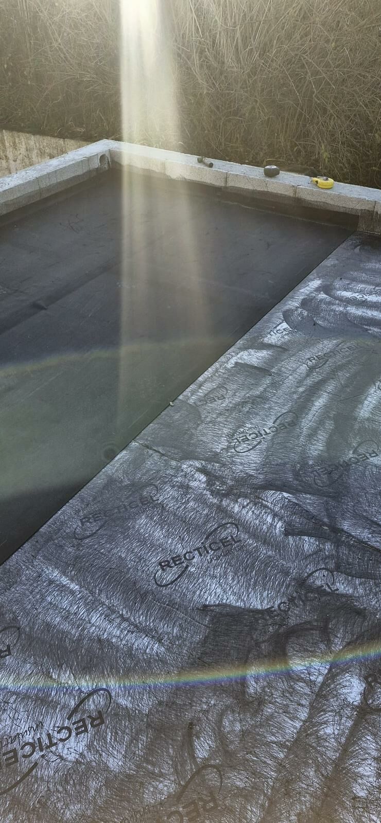 - Enfin, l’isolant de 16 cm a été installé de manière régulière, suivi de la pose de la membrane EPDM Restridex. Les panneaux d’isolant ont été posés en quinconce pour limiter les ponts thermiques et offrir une isolation performante. La membrane EPDM, ensuite déroulée et collée, assure l’étanchéité finale du toit grâce à sa grande résistance et sa longévité. L’ensemble du système—primaire, pare-vapeur, isolant et EPDM—garantit une toiture durable, efficace et parfaitement étanche