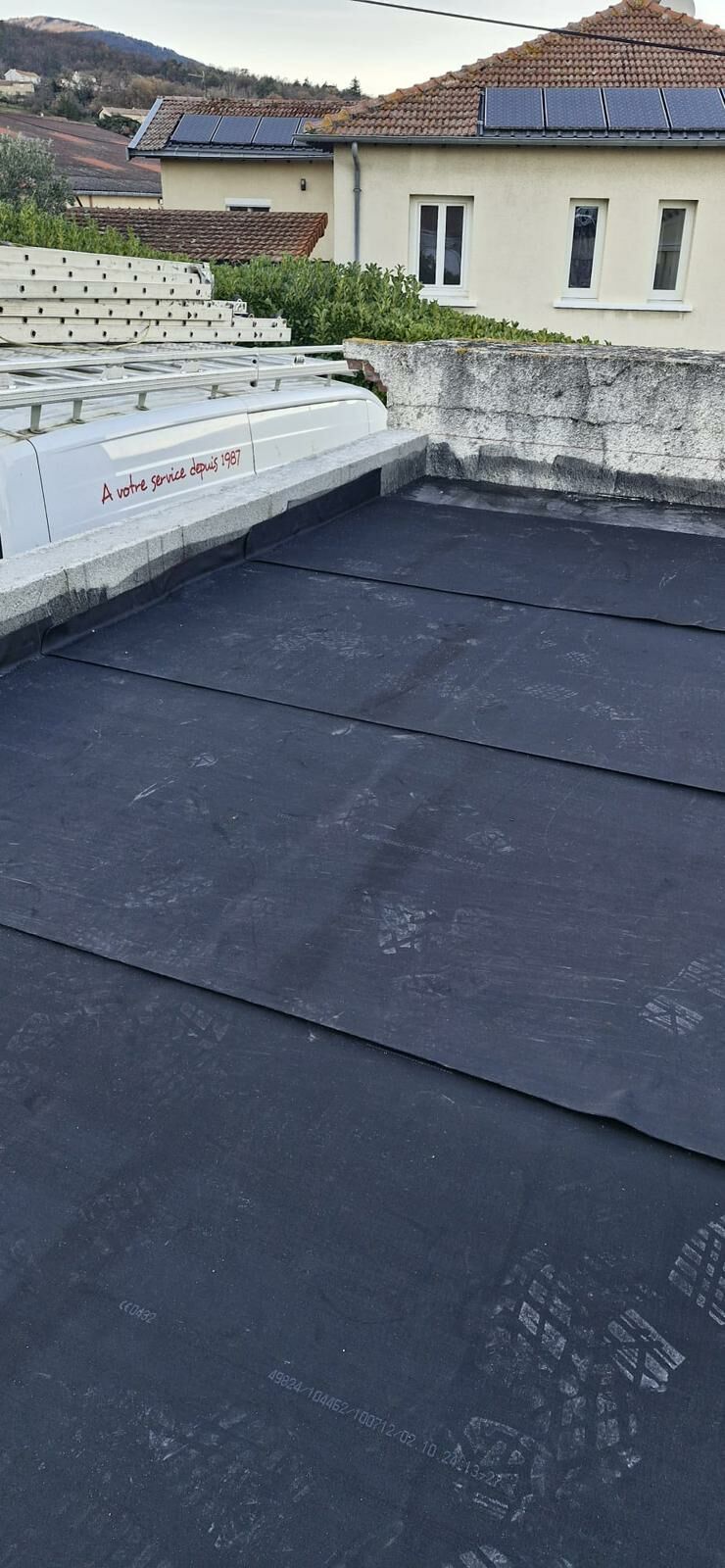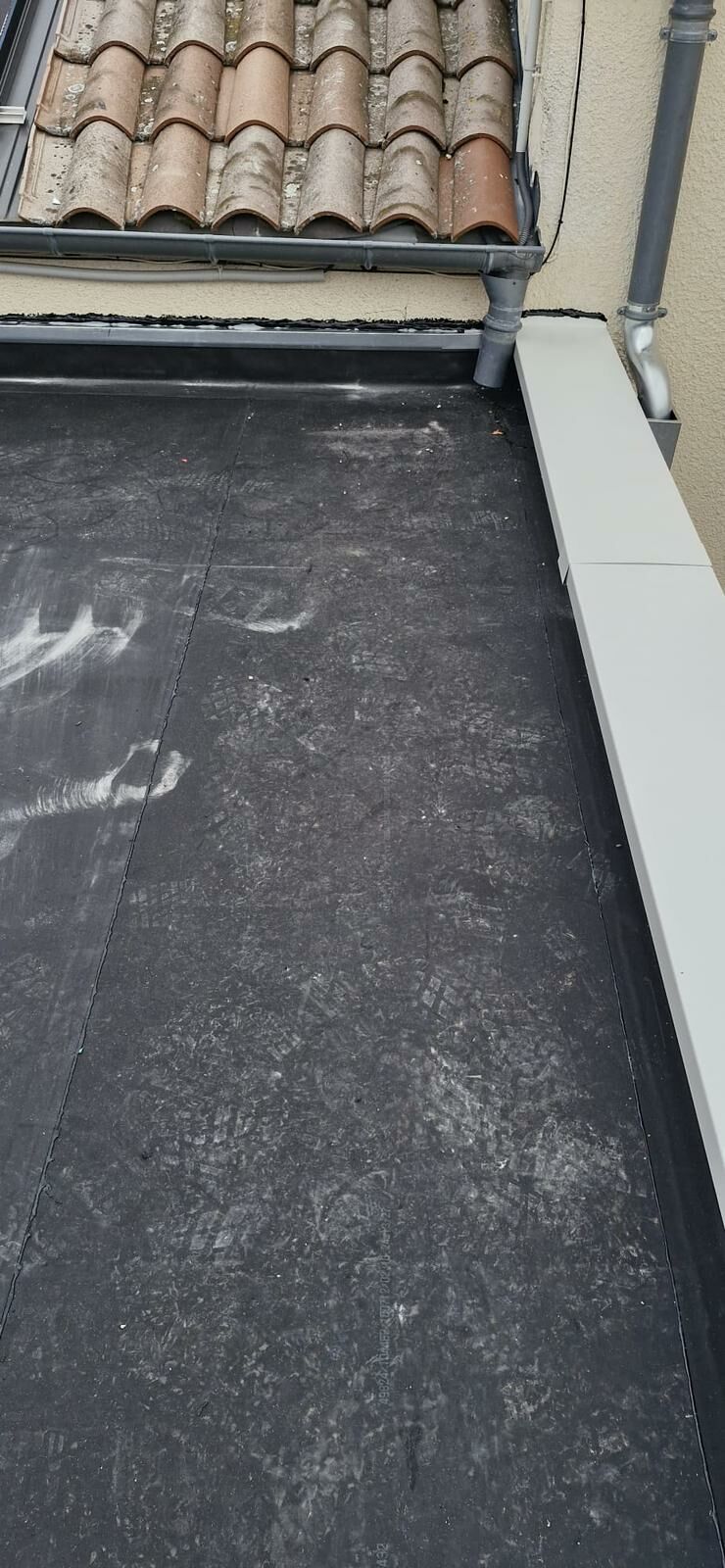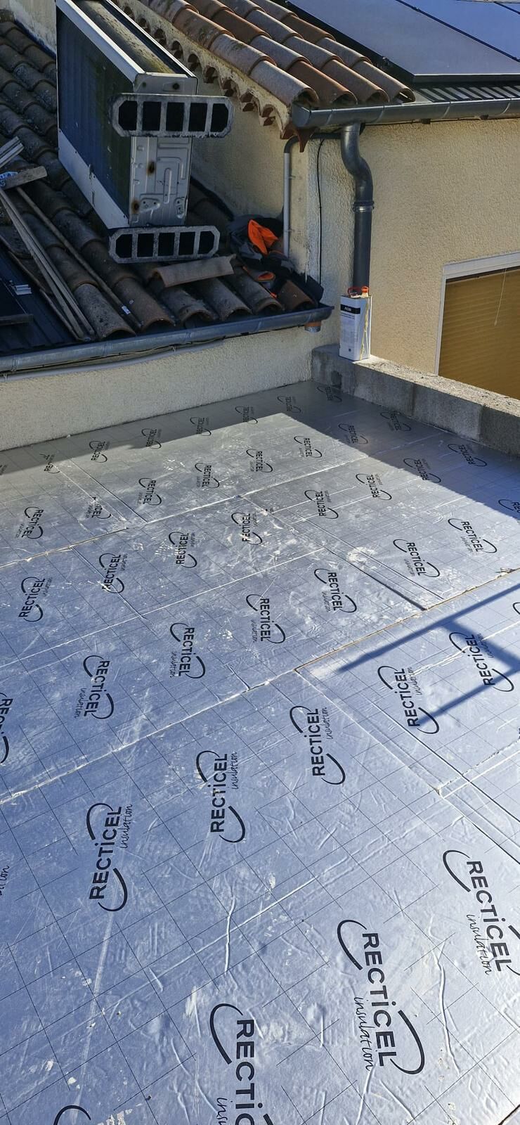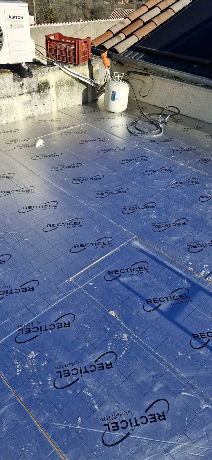 - Enfin, l’isolant de 16 cm a été installé de manière régulière, suivi de la pose de la membrane EPDM Restridex. Les panneaux d’isolant ont été posés en quinconce pour limiter les ponts thermiques et offrir une isolation performante. La membrane EPDM, ensuite déroulée et collée, assure l’étanchéité finale du toit grâce à sa grande résistance et sa longévité. L’ensemble du système—primaire, pare-vapeur, isolant et EPDM—garantit une toiture durable, efficace et parfaitement étanche