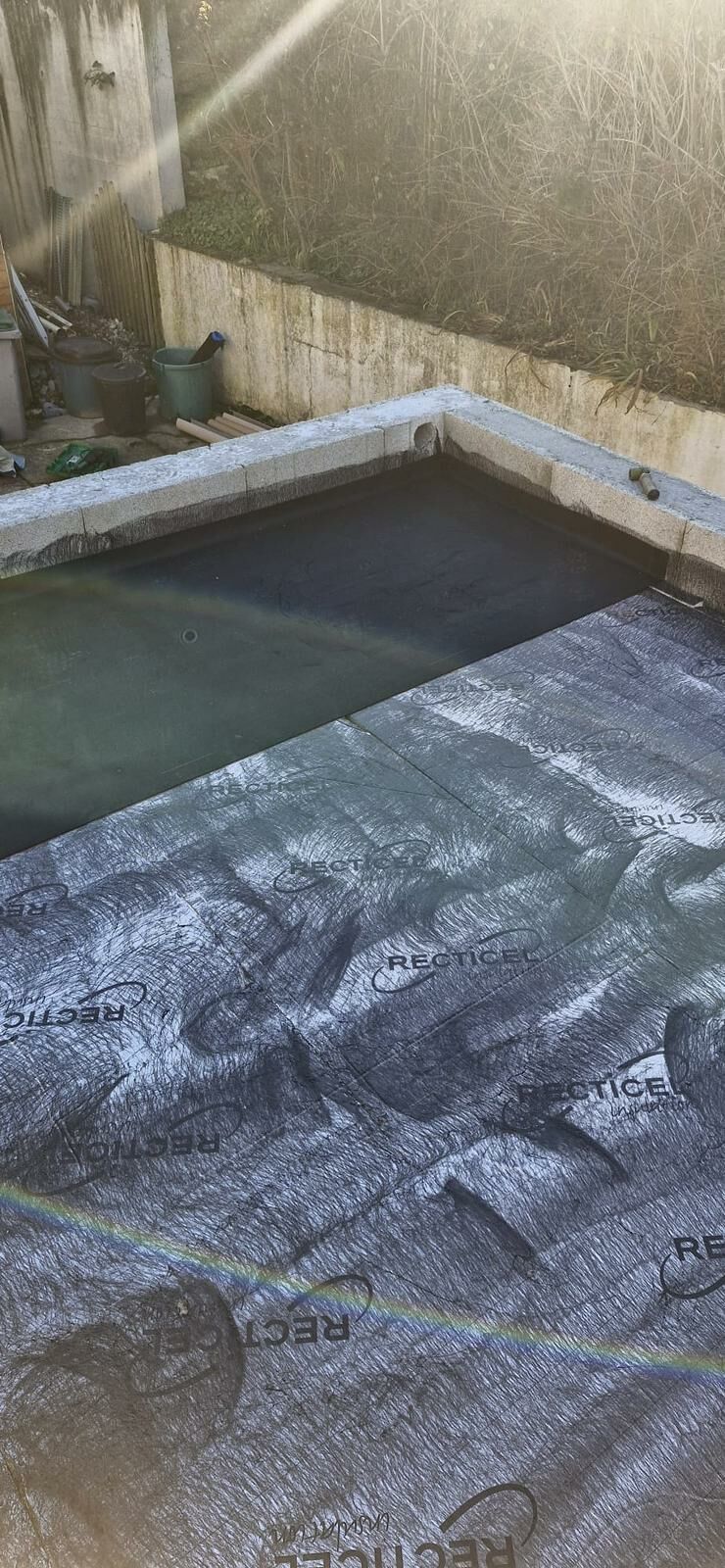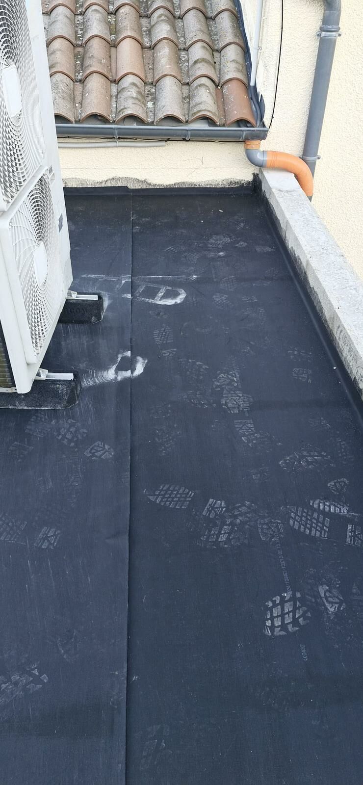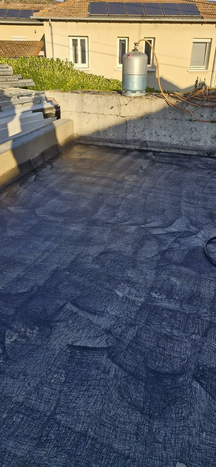 - Le chantier a débuté par la pulvérisation d’un primaire sur l’ensemble du support afin d’assurer une adhérence optimale pour les couches suivantes. Cette préparation permet de stabiliser la surface, de fixer les poussières résiduelles et de garantir une base propre et uniforme. L’application du primaire est une étape essentielle pour assurer la durabilité et la fiabilité du système d’étanchéité à venir.